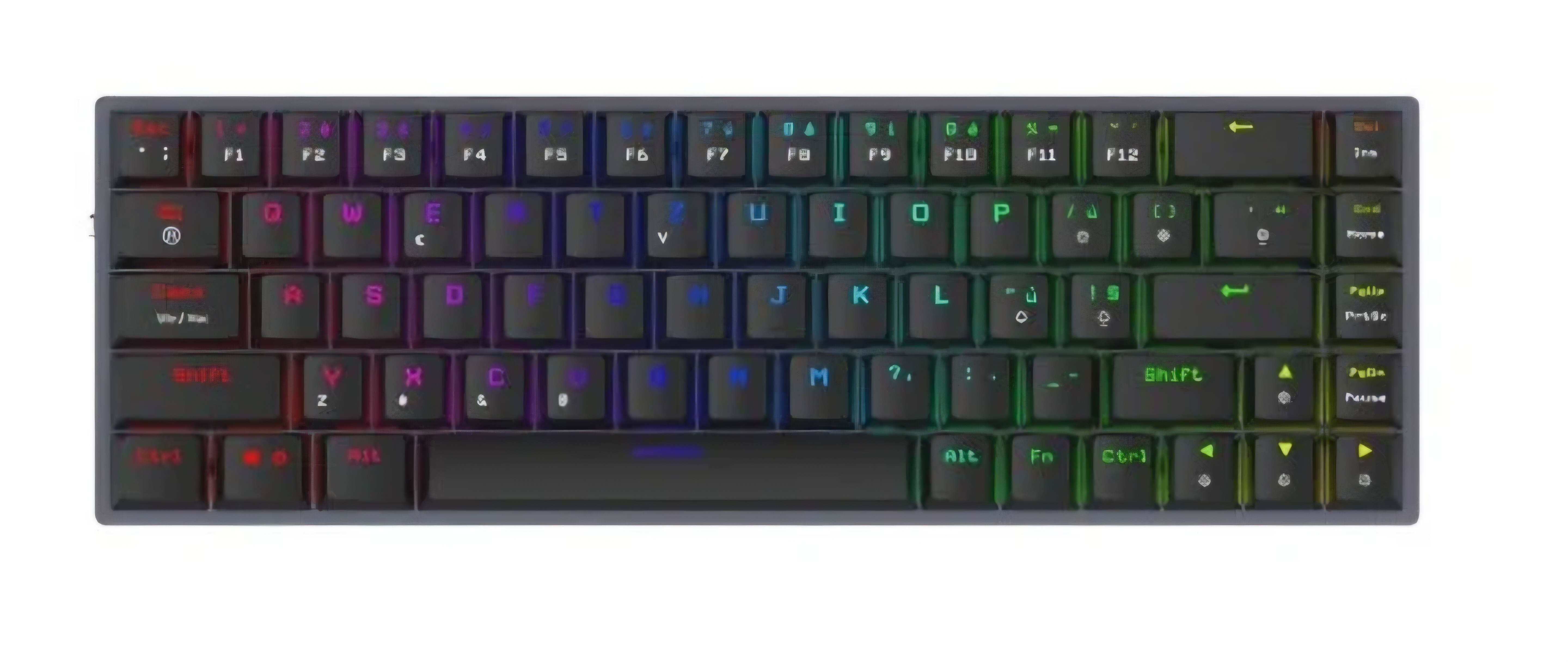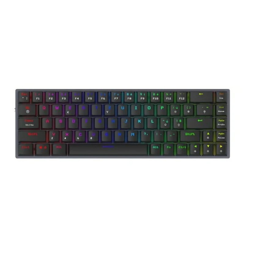 Herní klávesnice. Gateron Red nízkoprofilové lubrikované spínače. Hotswap PCB. US layout s CZ znaky. 68 kláves. Konfigurovatelné RGB podsvícení. N-key rollover. Bluetooth připojení. 2 000 mAh dobíjecí baterie. Odnímatelný 1,5m opletený USB-C kabel. Rozměry 311 × 100 × 29 mm. Hmotnost 535 g. Výdrž baterie až 70 hodin.
